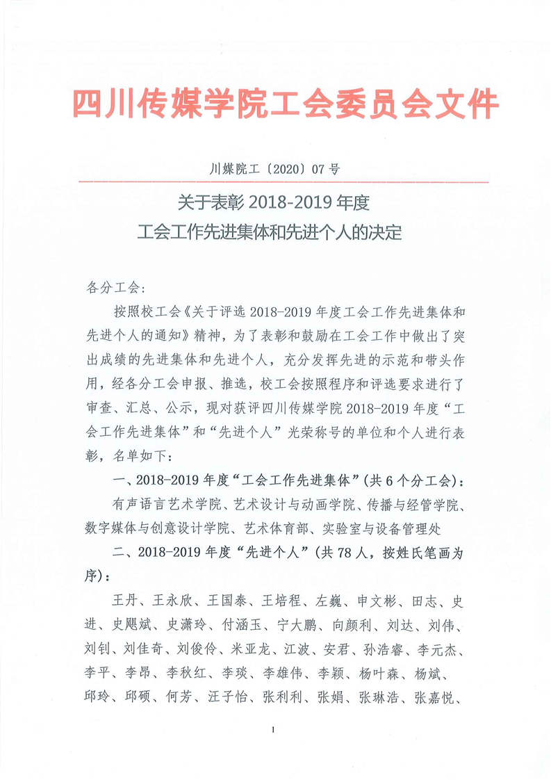 2020-7关于表彰2018-2019年度工会工作先进集体和先进个人的决定