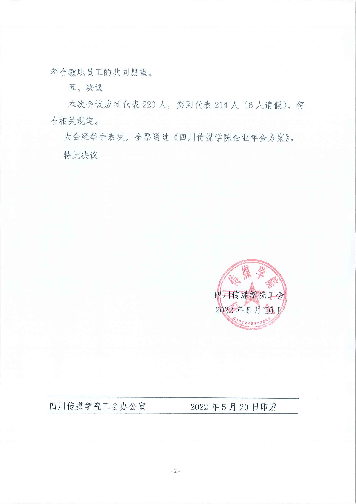 四川传媒学院工会第一届第五次教职工代表大会暨工会会员代表大会关于通过《四川传媒学院企业年金方案》的决议
