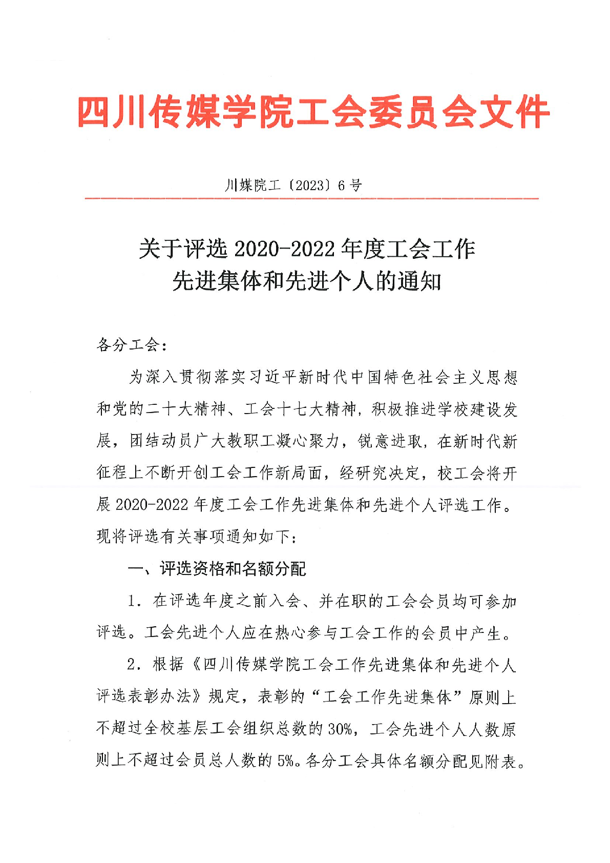 关于评选2020-2022年度工会工作先进集体和先进个人的通知