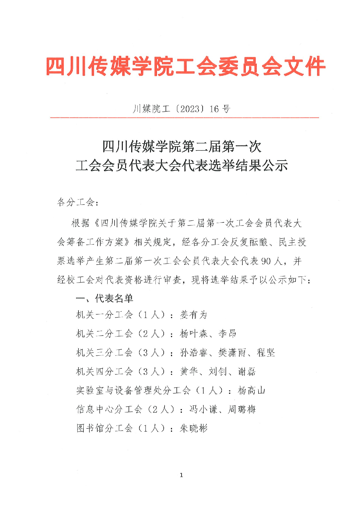 关于公布四川传媒学院第二届第一次工会会员代表大会代表选举结果的通知...