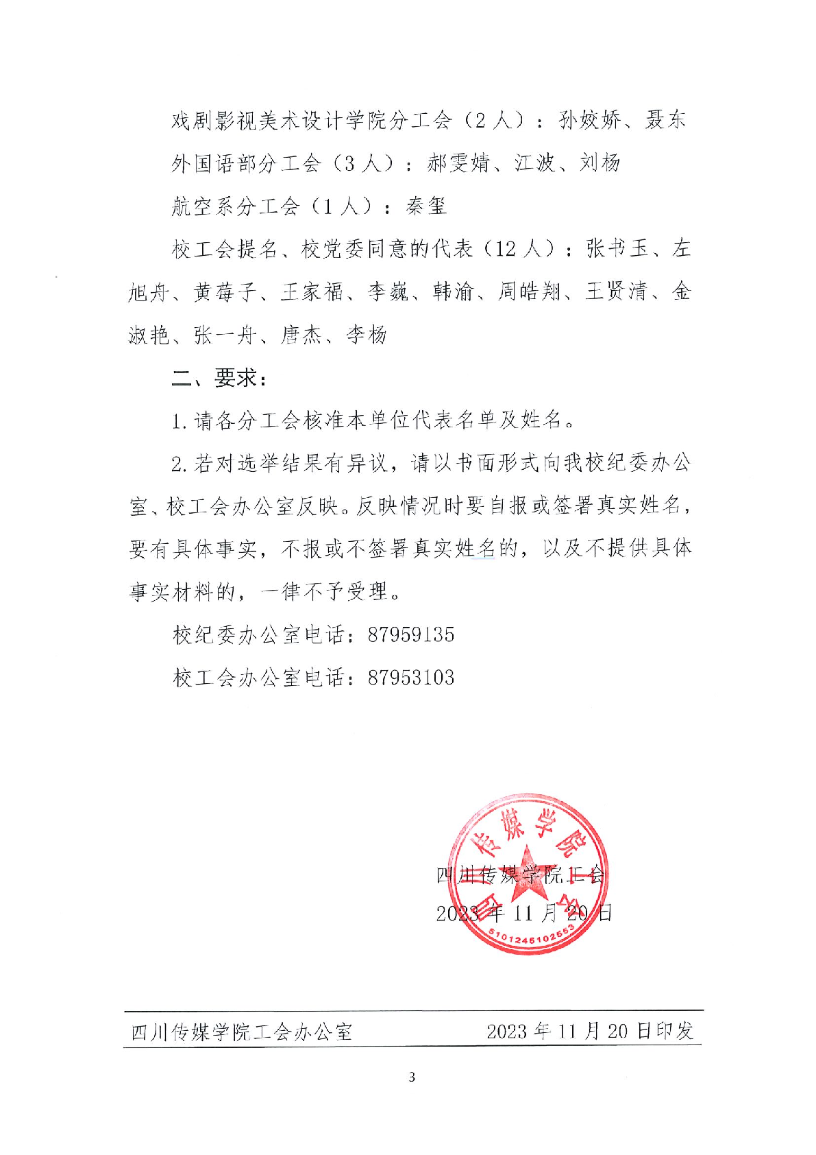 四川传媒学院第二届第一次工会会员代表大会代表选举结果公示