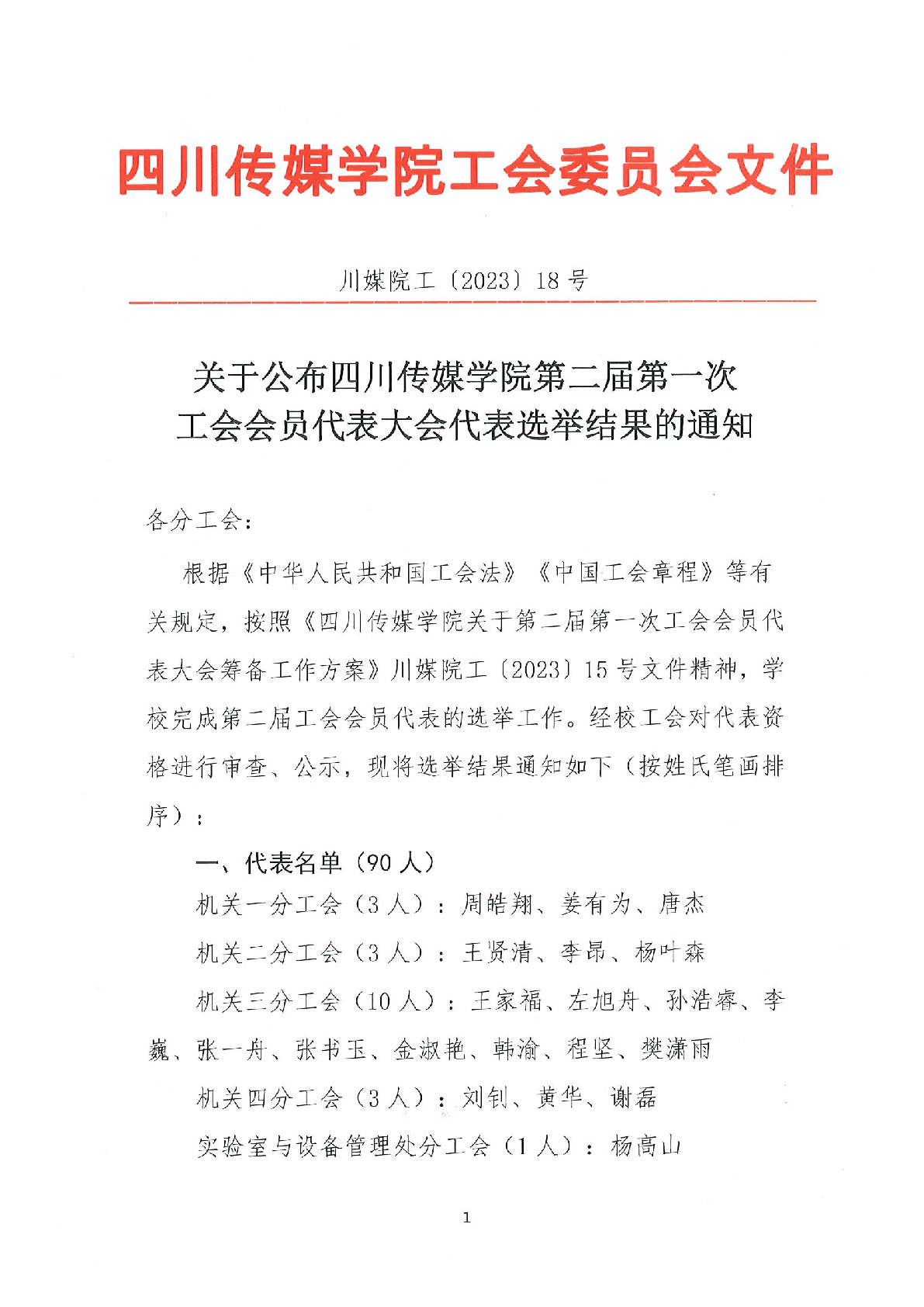 关于公布四川传媒学院第二届第一次工会会员代表大会代表选举结果的通知